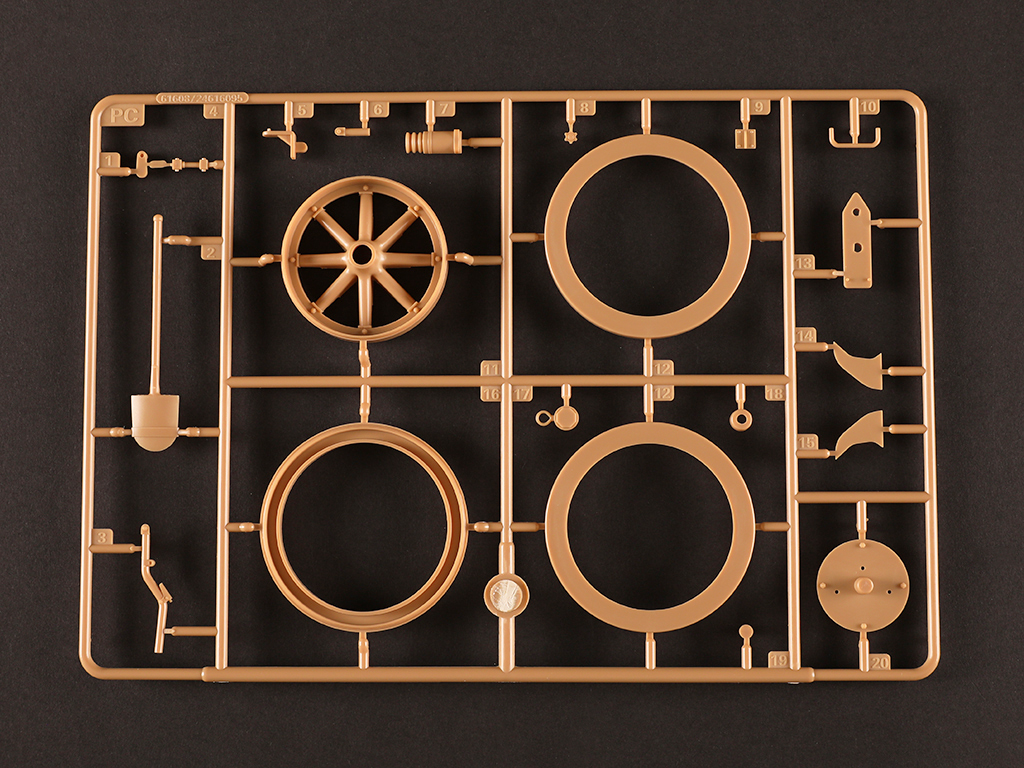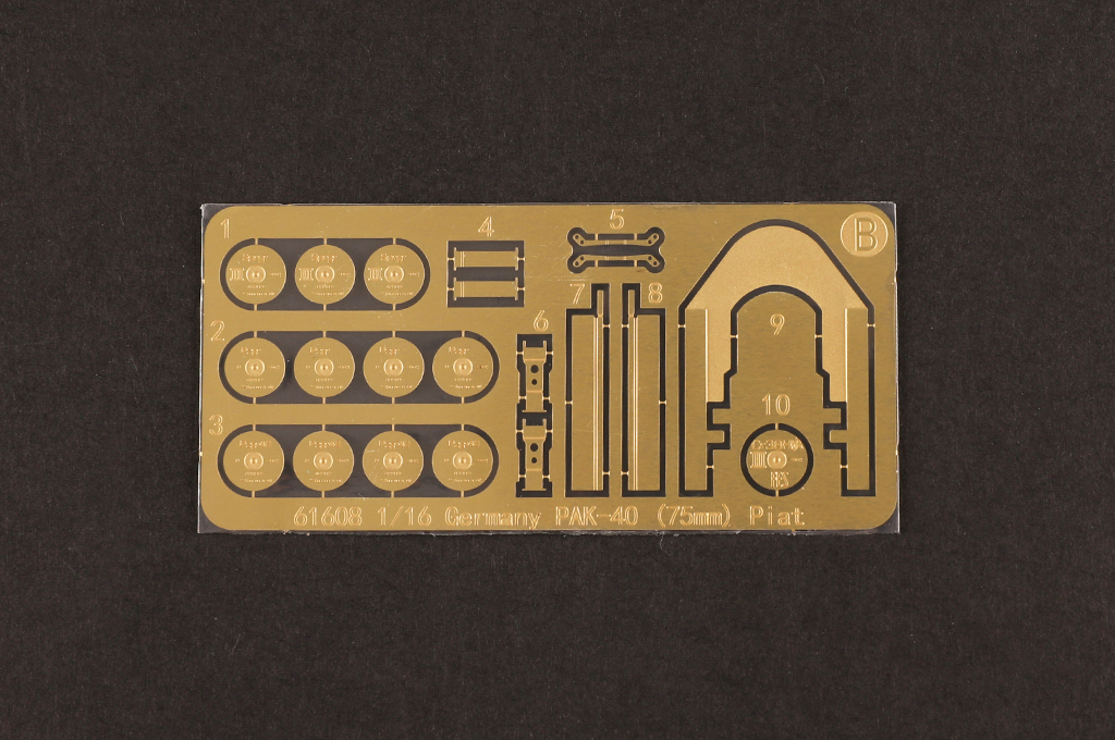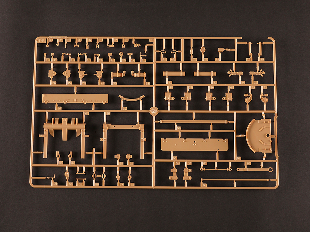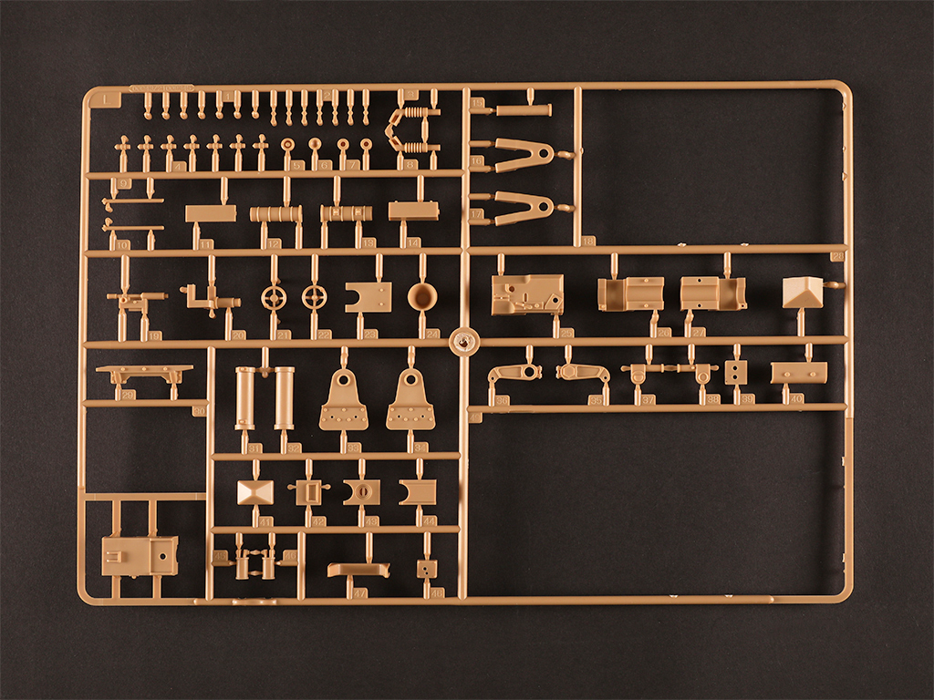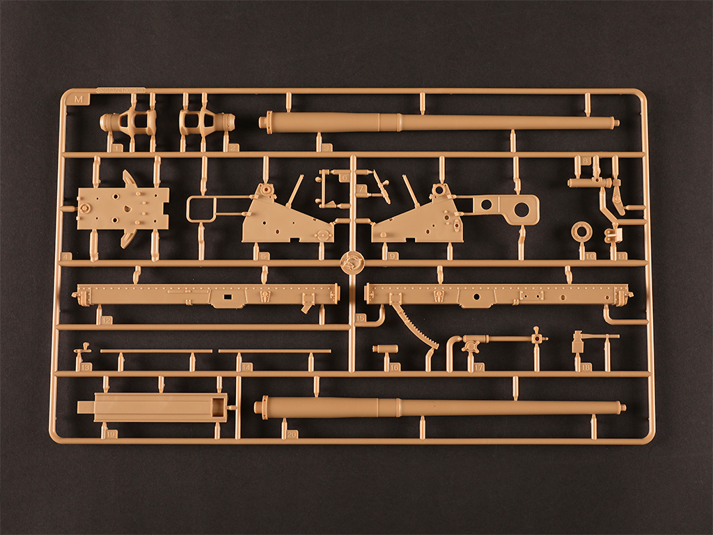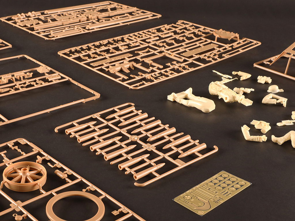 - gun trails with fine detail - Gun can elevate to different angles. - Either combat or travel mode can be selected for assembly. - Photo-etched parts included - two resin figures included |